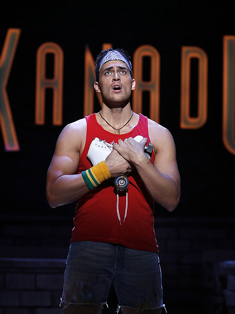 I am very mildly obsessed with the Broadway musical Xanadu. Hey, it's campy and very tongue-in-cheek and family friendly and funny and has the mark of Olivia Newton-John and has catchy tunes and gives out glowsticks. How come I am the only one who seems to know how to use a glowstick? Anyway, the first time I saw the show, an understudy (the cutie Curtis Holbrook) went on for the lead (the smokin' Cheyenne Jackson), Sonny Malone, the struggling dim artist. We were all disappointed that the lead was out, but the understudy was fabuloso. The second time I saw Xanadu, I introduced an old friend into the fold (Hi D!) and we were fortunate enough that Cheyenne was not out. At the end of the show, he wears some satin booty shorts and they are not long at all. And it hit me: Cheyenne Jackson is a true Hottie Hotpants! HH is Agent99's term for a super attractive fella. I just like saying Hottie Hotpants. And I got my picture taken with this handsome man. I am happy. In case you're wondering, the infamously bad Xanadu movie is not as rotten as you would expect. Olivia is winsome but the guy who plays Sonny couldn't act his way out of a brown paper bag. The soundtrack is rad and is one of its saving graces. Poor Gene Kelly. I wonder how he got roped into doing Xanadu?
